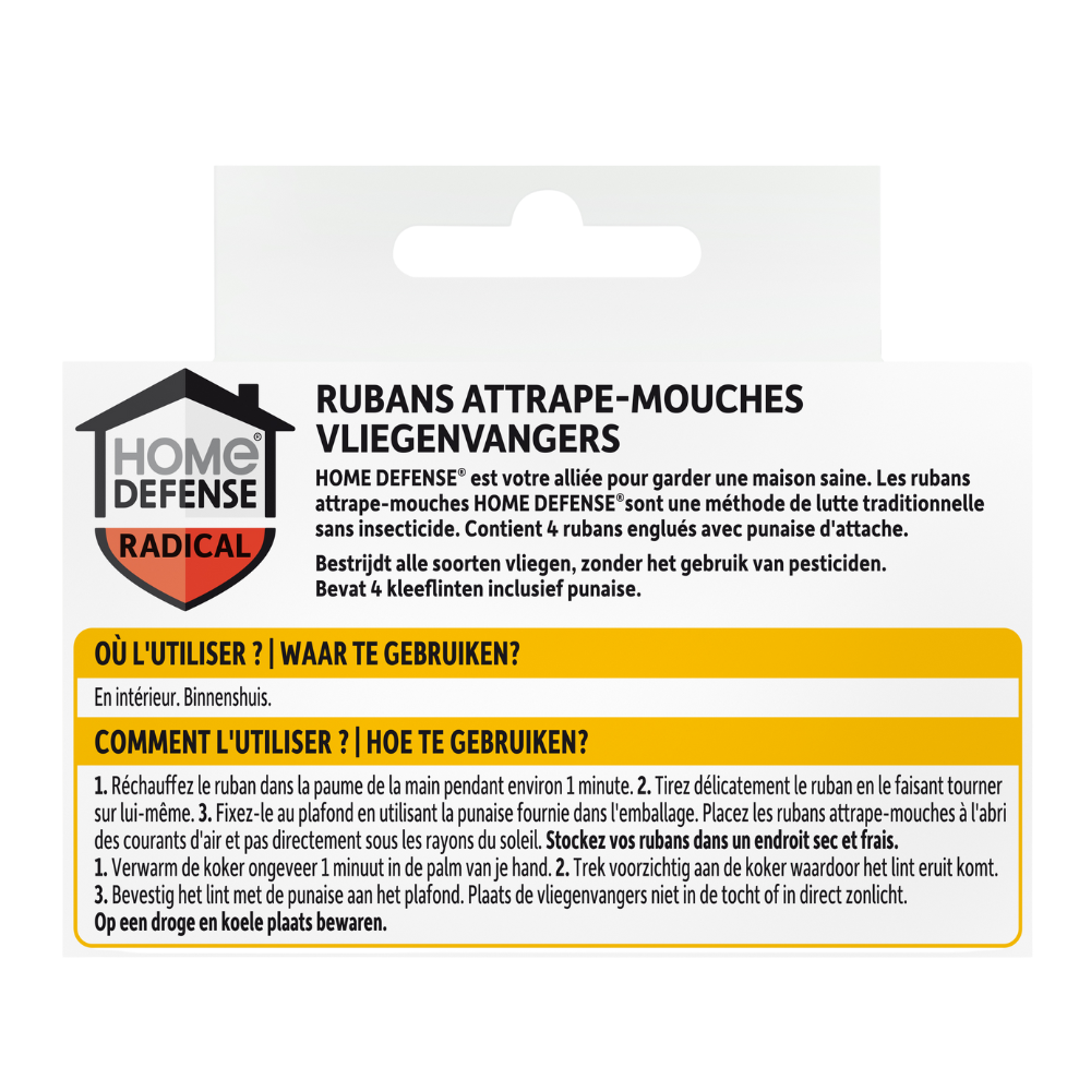 HOME DEFENSE® Vliegenvangers Kleeflinten zijn vliegenvangers geschikt voor binnenshuis. De kleeflinten bestrijden eenvoudig alle soorten vliegen zonder het gebruik van pesticiden. Deze verpakking bevat 4 kleeflinten inclusief punaises en is werkzaam tot 6 weken. Veilig te gebruiken in de buurt van kinderen en huisdieren.